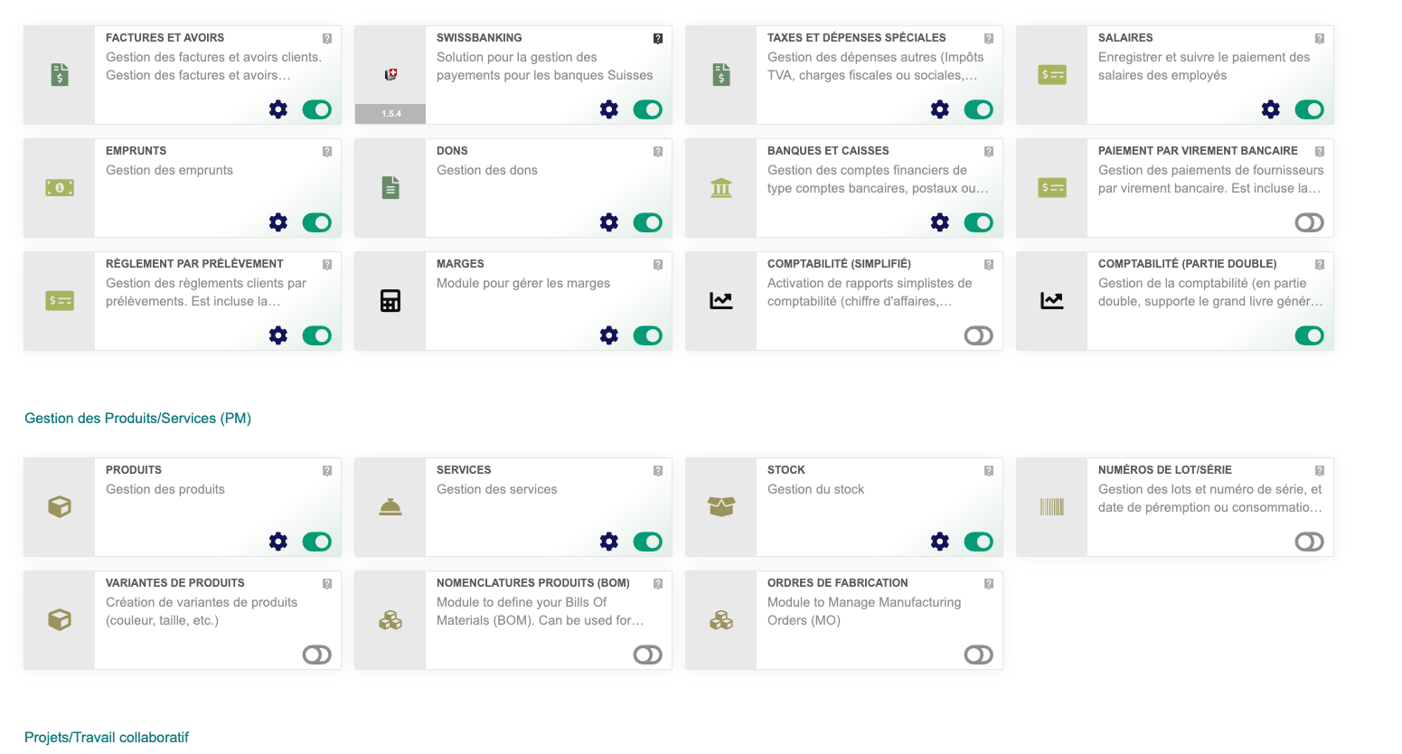 Dolibarr offre une multitude de fonctionnalités disponibles nativement, activables à la demande comme la facturation, les devis, les commandes, les contrats, gestion du stock, production, nomenclature, comptabilité, etc.